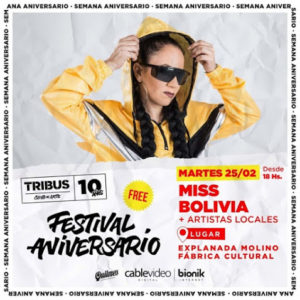 Los días lunes 24 y martes 25 de febrero, se llevará a cabo el Festival Aniversario por los 10 años de Tribus Club de Arte.. Participarán Lo’ Pibitos, grupo formado en el 2006 e integrado por Tomás Bacigaluppi, Guido Ruggiero, Jeremías Segall de Rosa, Juan Giménez Kuj, Marto Aguilar, Andrés Cortes, Infinito y Juan Lucas Arbe. Luego de varios años en el escenario porteño, el público se identificó rápidamente con la banda, convirtiéndola en un exponente de la expresión urbana. y Miss Bolivia que fusiona estilos urbanos, cumbia, hip hop, dancehall, electro y pop combinando la frescura y provocación de lo digital con la potencia de los ritmos y elementos originarios. y artistas locales. Además de música en vivo, habrá DJ’s, gastronomía y food trucks.