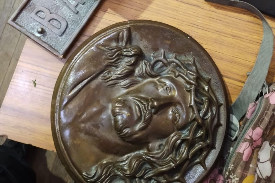 En la huida deja en el suelo una mochila floreada que en su interior contenía dos placas de bronce, una rectangular y otro redondo con la cara de Jesucristo; un destornillador, y nada más ni nada menos que su Documento Nacional de Identidad que sirvió para identificarlo.