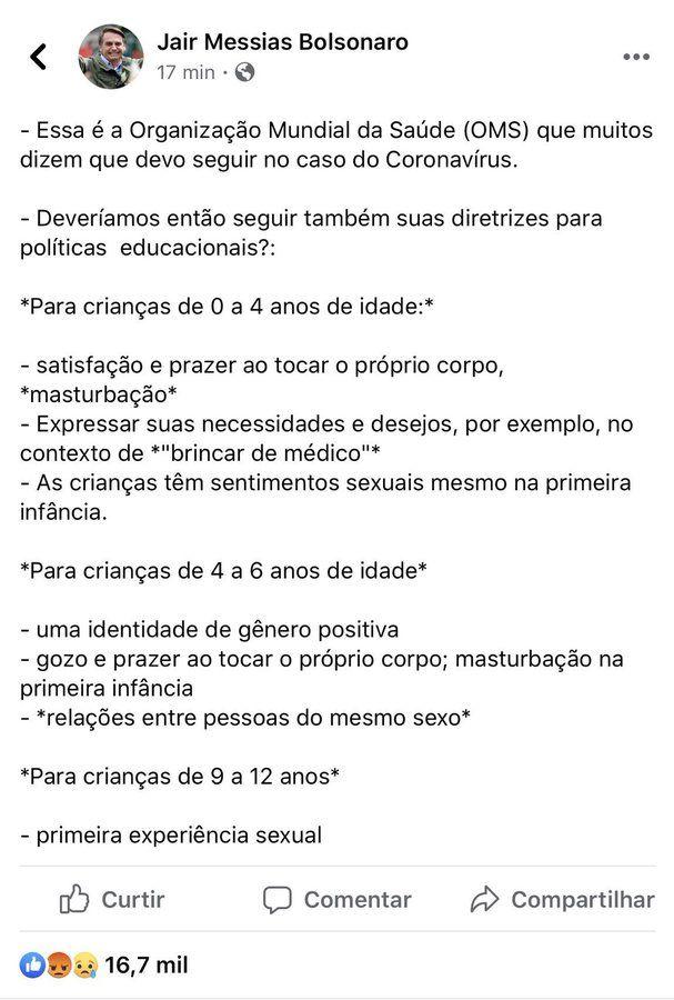 La excéntrica acusación se basa en un texto publicado en 2010 por la Organización Muncial de la Salud en colaboración con el Centro Federal de Educación y Salud de Alemania, sobre la base de tratados psicopedagógicos y estudios psicológicos de la infancia. Sin embargo, el presidente de Brasil hizo una extravagante interpretación de algunos puntos y la publicó en cuenta oficial de Facebook.
