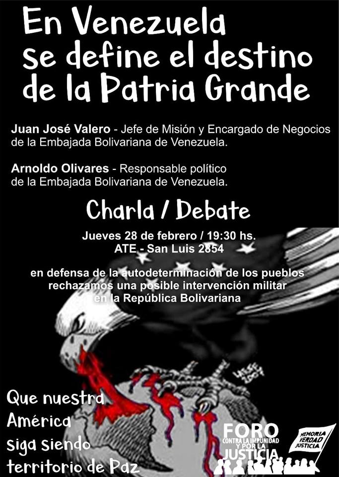 Hoy a las 19:30 se realizará en ATE, San Luis 2854, la charla debate: En Venezuela se define el destino de la Patria Grande.