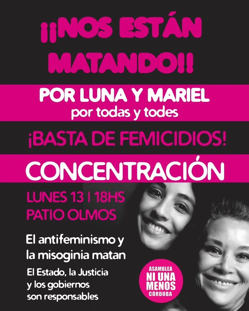 La organización Ni Una Menos Córdoba convocó a una movilización para este lunes a las 18 en el Patio Olmos bajo la consigna “Justicia por Luna y Mariel”. La marcha se realizará después del brutal doble femicidio de Luna Giardina y Mariel Zamudio, madre e hija asesinadas el sábado pasado en el barrio Villa Serrana, y cuyo caso conmocionó a la provincia y al país.