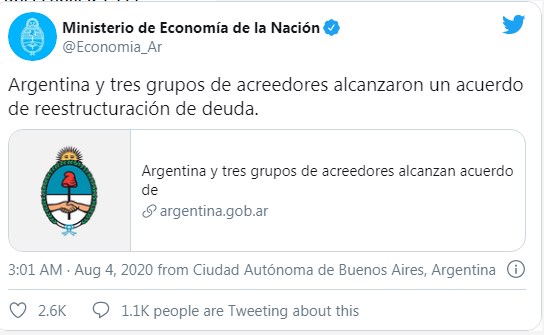 El Gobierno y los acreedores internacionales llegaron a un acuerdo para cerrar la reestructuración de la deuda. A las tres de la mañana del martes se dio a conocer el anuncio oficial a través de un tuit del Ministerio de Economía, donde se consignaba el documento conjunto con los tres principales grupos de bonistas. Previendo ese final, el mercado había reaccionado ante las novedades que se fueron conociendo a lo largo del lunes con saltos de más del 10 por ciento en el precio de las acciones.