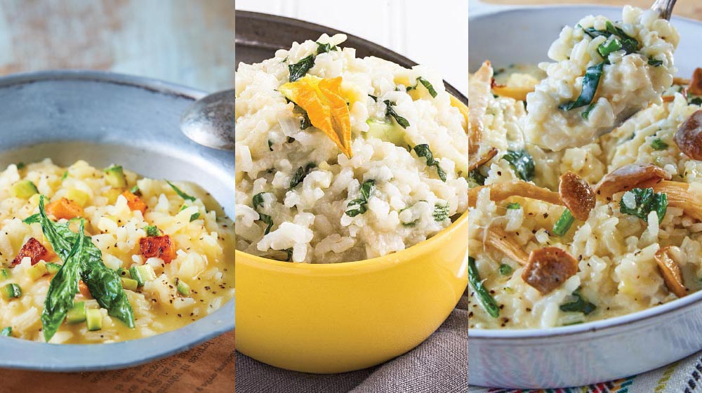Bañar con el vino blanco y subir el fuego hasta que se evapore el alcohol. De a poco, agregar caldo tibio y a medida que se va consumiendo, repetir la acción hasta que el arroz quede tierno y jugoso (entre 20 a 25′). Retirar del fuego, agregar el queso y la manteca y mezclar hasta que el arroz este cremoso.