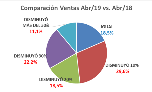 Dentro de ese 81,5% se desglosó de la siguiente manera: un 29,6% afirmó haber disminuido un 10% en sus ventas, un 18,5% dijo haber disminuido sus ventas en un 20%, un 22,2% afirmó que sus ventas cayeron en un 30% y finalmente un 11,2% dijeron que sus ventas cayeron más del 30%.