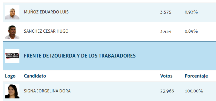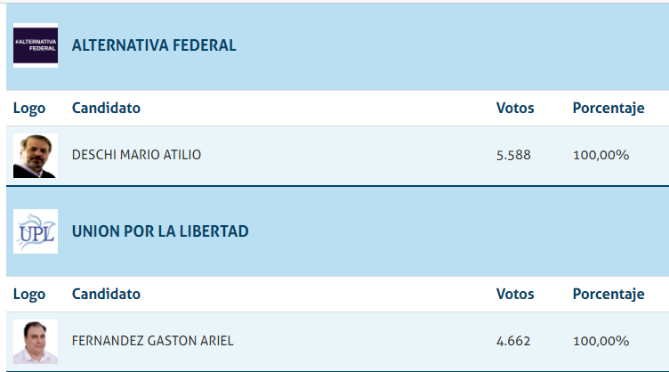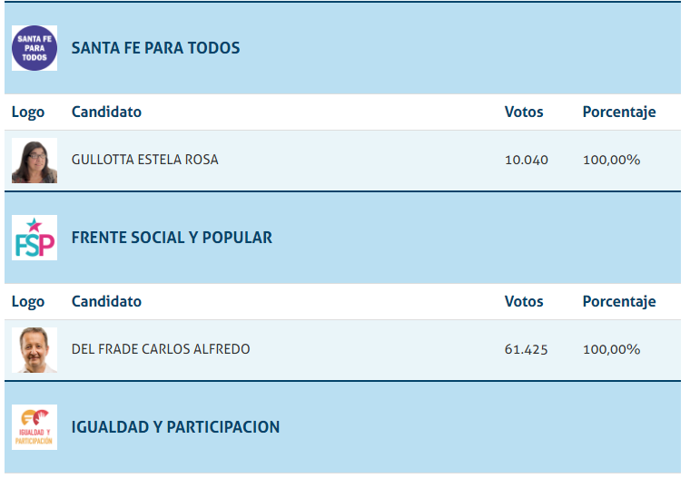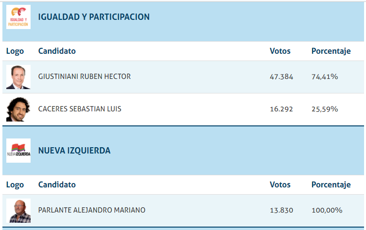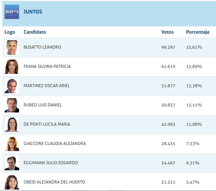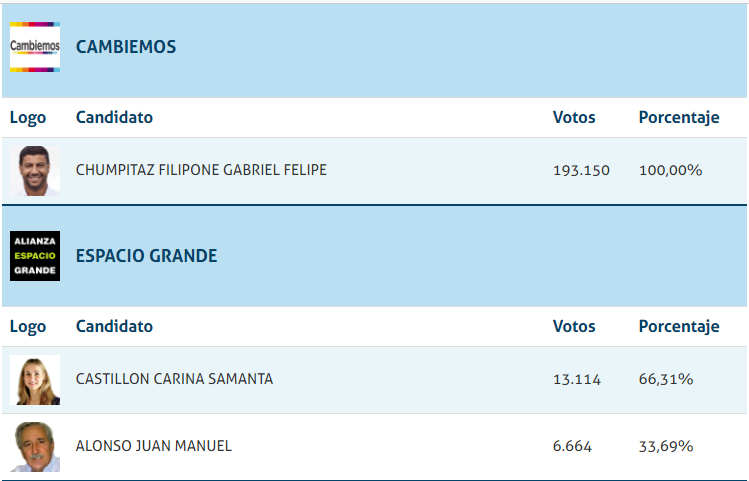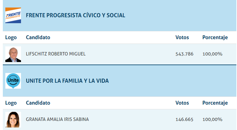 Escrutados el 97,32 de los votos, inegablemente el gran ganador ha sido el actual gobernador Miguel Liftchitz, seguiro por Gabriel Felipe Chumpitaz, y la muy buena elección de Amalia Granata. Dentro del espacio Juntos Leandro Busatto, Silvina Frana y Oscar Cachi Martinez en ese orden fueron los más elegidos.
