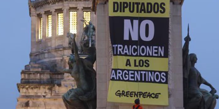 Greenpeace realiza una acción para visibilizar el rechazo a la reforma de la Ley de Glaciares. Activistas escalaron la estatua de la República de la Plaza de los dos Congresos y desplegaron el mensaje.