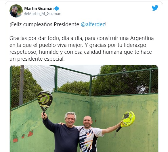 “¡Feliz cumpleaños Presidente @alferdez! Gracias por dar todo, día a día, para construir una Argentina en la que el pueblo viva mejor. Y gracias por tu liderazgo respetuoso, humilde y con esa calidad humana que te hace un presidente especial“, escribió el ministro de Economía, Martín Guzmán.