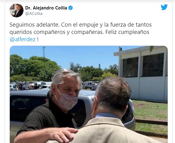 Por su parte, el subsecretario de Gestión de Servicios e Institutos del Ministerio de Salud de la Nación, Alejandro Collia, escribió: “Seguimos adelante. Con el empuje y la fuerza de tantos queridos compañeros y compañeras. ¡Feliz cumpleaños @alferdez!“.
