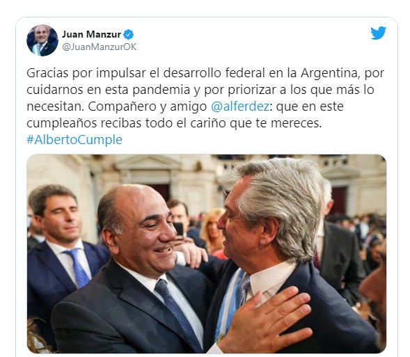 Gracias por impulsar el desarrollo federal en la Argentina, por cuidarnos en esta pandemia y por priorizar a los que más lo necesitan. Compañero y amigo @alferdez: que en este cumpleaños recibas todo el cariño que te mereces”, deseo Juan Manzur, gobernador de Tucumán.