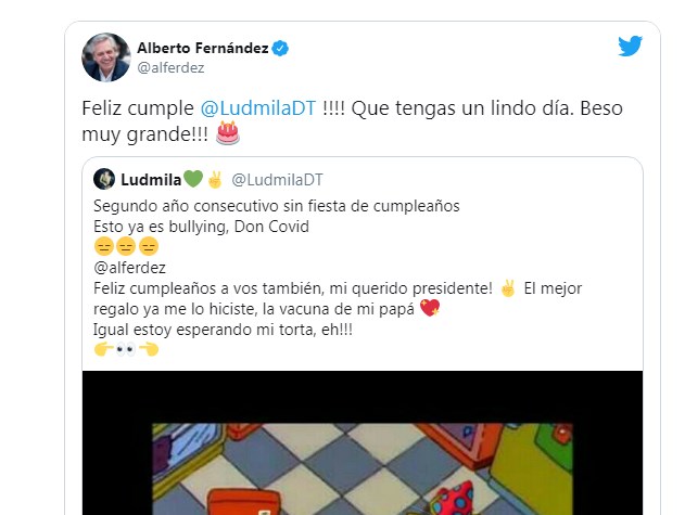 A una militante que hoy también cumple años, les escribió: “Segundo año consecutivo sin fiesta de cumpleaños. Esto ya es bullying, Don Covid @alferdez Feliz cumpleaños a vos también, mi querido presidente! Mano de victoria El mejor regalo ya me lo hiciste, la vacuna de mi papá Corazón con destellos Igual estoy esperando mi torta, eh!!!“.