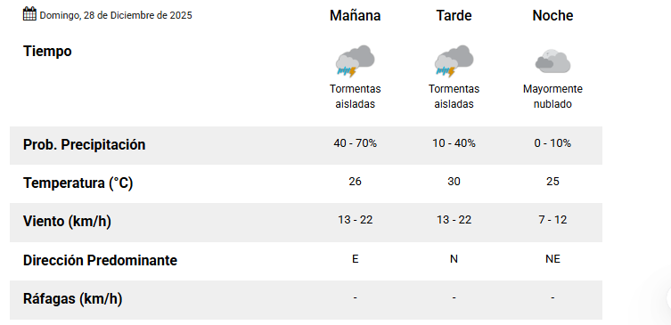 El SMN pronostica para hoy domingo 28 de diciembre 2025 en la ciudad de Santa Fe de la Vera Cruz capital de la provincia de Santa Fe República Argentina.