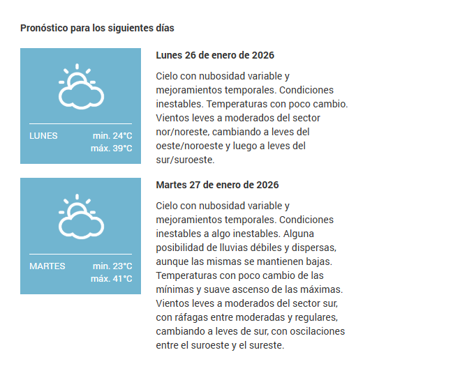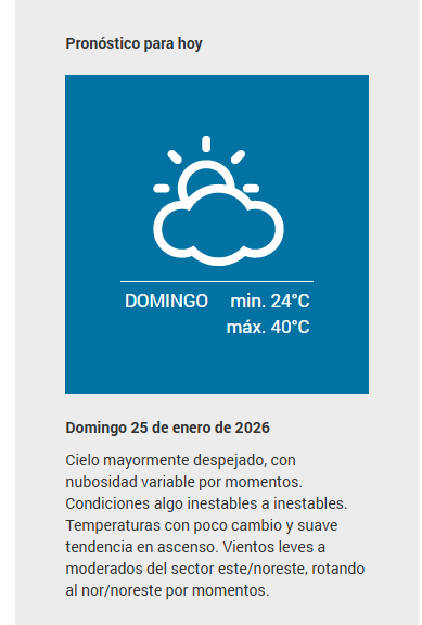 El SMN pronostica para hoy domingo 25 de enero 2026 en la ciudad de Santa Fe de la Vera Cruz capital de la provincia de Santa Fe República Argentina.