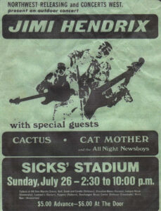 1970- Jimi Hendrix toca en su ciudad natal de Seattle por última vez, cuando se presentó en el Sicks Stadium.