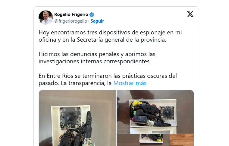 Desde el Gobierno de Entre Ríos se denunció el hallazgo de dispositivos de espionaje en la oficina del Gobernador y la Secretaría General de la Gobernación.