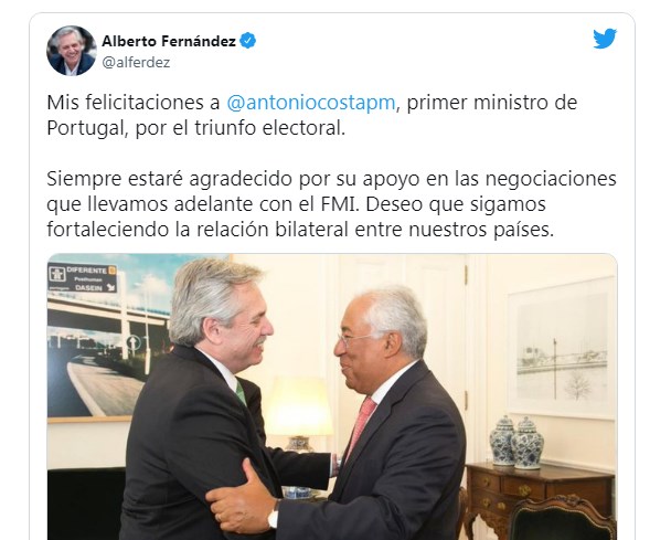 “Siempre estaré agradecido por su apoyo en las negociaciones que llevamos adelante con el FMI. Deseo que sigamos fortaleciendo la relación bilateral entre nuestros países”, aseguró Alberto Fernández en un posteo de Twitter tras felicitar al mandatario portugués.