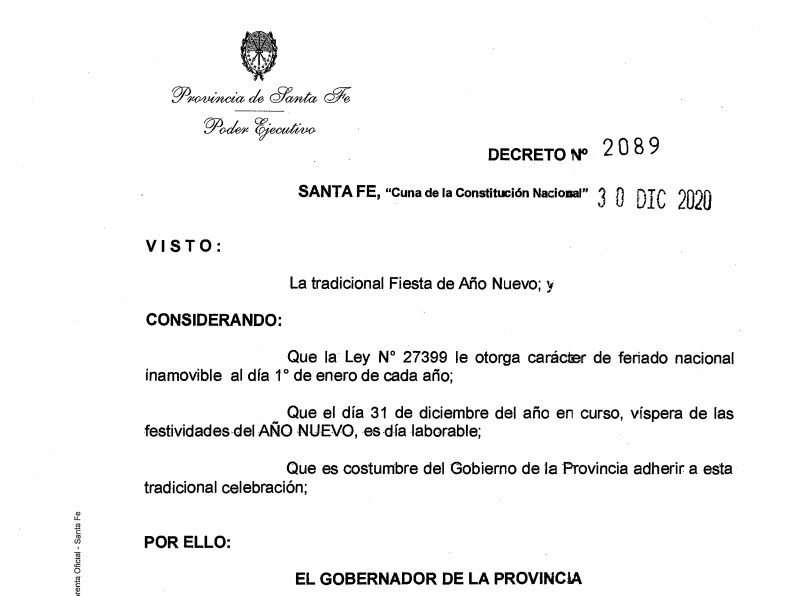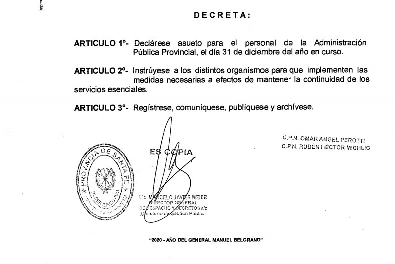 El gobierno de Santa Fe, a través del decreto Nº 2089 del gobernador Omar Perotti, declaró asueto para el personal de la Administración Pública Provincial para el día 31 de diciembre del año en curso.