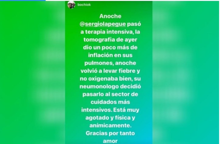 Su esposa Silvia dio a conocer la información a través de un posteo en su cuenta de Instagram, en la cual viene comunicando la evolución de su marido: “Anoche pasó a terapia intensiva. La tomografía de ayer dio un poco más de inflamación en sus pulmones y presenta fiebre (…).