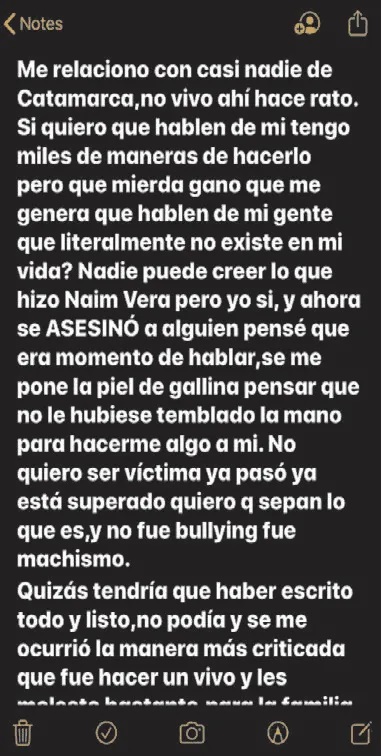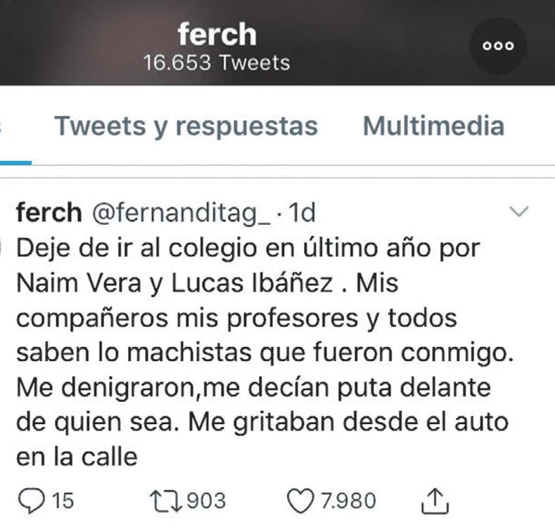 “Dejé de ir al colegio en último año por Naim Vera y Lucas Ibáñez. Mis compañeros, mis profesores y todos saben lo machistas que fueron conmigo. Me denigraron, me decían ‘puta’ delante de quien sea. Me gritaban desde el auto en la calle”, escribió la joven.