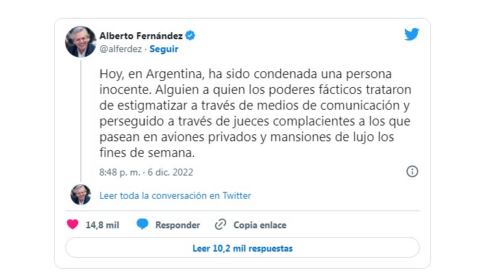Fernández calificó en Twitter a la vicepresidenta como “alguien a quien los poderes fácticos trataron de estigmatizar a través de medios de comunicación y perseguido a través de jueces complacientes a los que pasean en aviones privados y mansiones de lujo los fines de semana”.