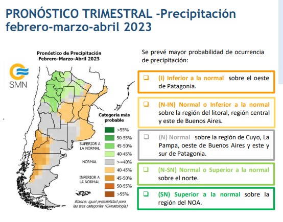 Respecto del pronóstico para los próximos meses, el SMN informó que “las precipitaciones pueden ser normales o inferiores a lo normal en el Litoral, norte y centro del país y sur de Patagonia”. Por otra parte, señaló que “hay una mayor probabilidad de que se registren lluvias dentro de la media en Cuyo, La Pampa, Buenos Aires y todo el este patagónico”.