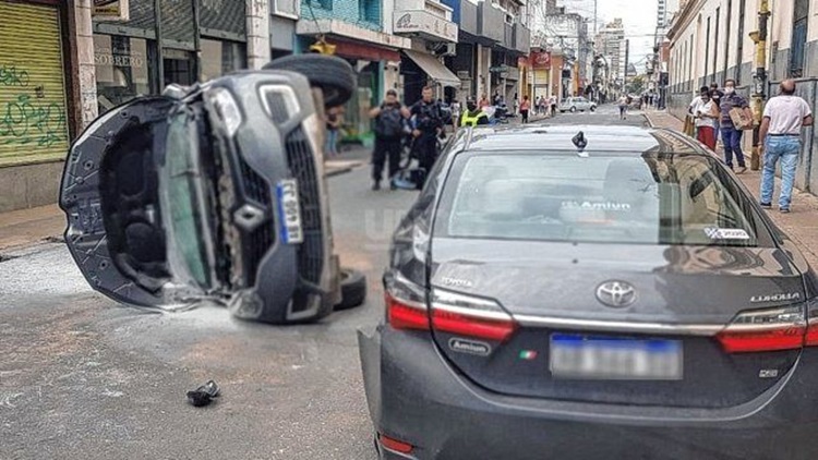 Antes del mediodía, en la zona del microcentro santafesino, se produjo el impresionante vuelco de un auto en San Jerónimo al 2100. En un primer momento todo fue muy confuso, ya que el protagonista del siniestro escapó, herido, del lugar.