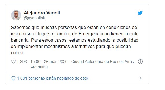 “El lunes presentaremos una denuncia penal contra quienes hemos detectado queriendo lucrar con la necesidad de la gente, pretendiendo cobrar por un trámite gratuito como el acceso al Ingreso Familiar de Emergencia”, publicó hoy Vanoli en Twitter.