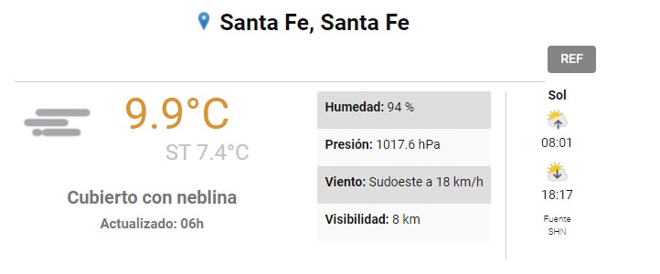 El SMN pronostica para hoy jueves 15 de julio para la ciudad de Santa Fe :