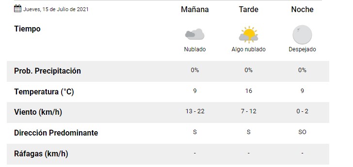 Cielo mayormente nublado a parcial nublado. Condiciones algo inestables en las primeras horas del día, mejorando. Temperaturas en descenso de las mínimas y poco cambio en las máximas. Vientos moderados predominantes del sector sur/suroeste, con algunas ráfagas.