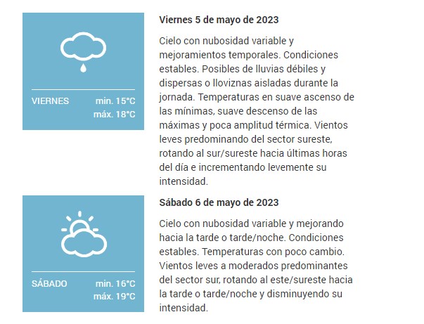 Cielo con nubosidad variable y mejoramientos temporales. Condiciones estables. Alguna posibilidad de lluvias débiles y dispersas o lloviznas hacia la tarde/noche o la noche. Temperaturas con suave tendencia en ascenso. Vientos leves del sector sur/sureste, rotando al este últimas horas del día.