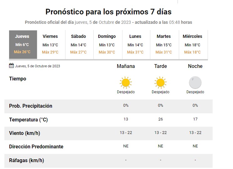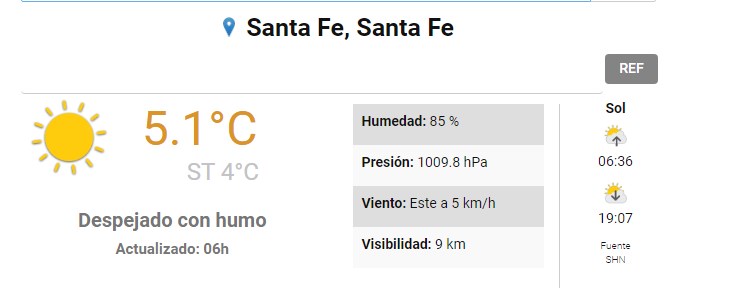 En tanto que el Centro de Informaciones Meteorológicas de la FICH pronostica para hoy jueves 5 de octubre 2023 para la ciudad de Santa Fe