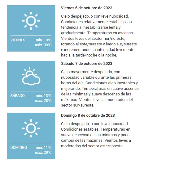 Cielo despejado o con leve nubosidad. Condiciones estables. Temperaturas en suave descenso de las mínimas y suave ascenso de las máximas. Vientos leves a moderados del sector nor/noreste, rotando al norte por momentos.