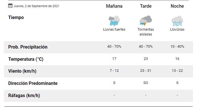El SMN pronostica para hoy jueves 2 de septiembre 2021 para la ciudad de Santa Fe