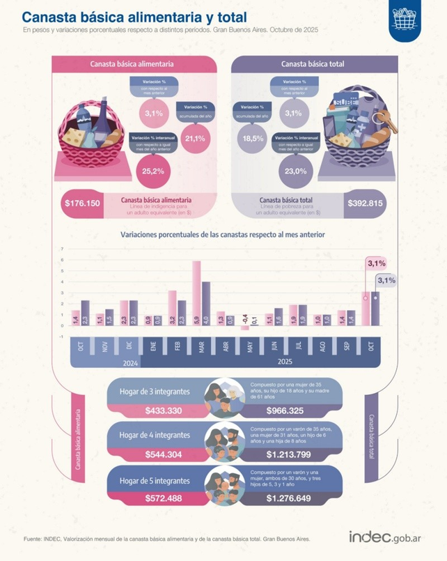 La canasta básica total (CBT) registró un incremento de 3,1% en octubre, por lo que una familia tipo de cuatro integrantes necesitó $1.213.799 para no quedar por debajo de la línea de pobreza, según informó este miércoles el Instituto Nacional de Estadística y Censos (Indec). La suba se ubicó por encima de la inflación general, que fue de 2,3% en el mismo mes.