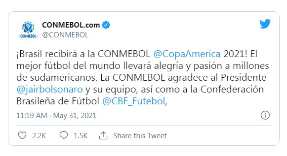 “¡Brasil recibirá a la CONMEBOL @CopaAmerica 2021! El mejor fútbol del mundo llevará alegría y pasión a millones de sudamericanos. La CONMEBOL agradece al Presidente @jairbolsonaroy su equipo, así como a la Confederación Brasileña de Fútbol @CBF_Futebol, por abrir las puertas de ese país al que es hoy en día el evento deportivo más seguro del mundo.