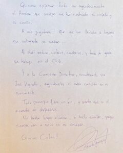 En la nueva carta, Eduardo confiesa que “Todo principio tiene un fin” y que siente que es el momento de despedirse, agregado del famoso “hasta siempre” pero con el único significado de que la gente de Colón siempre va a estar en su corazón.