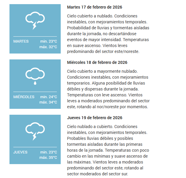 Cielo parcial nublado a nublado. Condiciones algo inestables a inestables. Posibilidad de lluvias débiles y dispersas en la tarde/noche. Temperaturas con poco cambio. Vientos leves a moderados predominando del sector este.