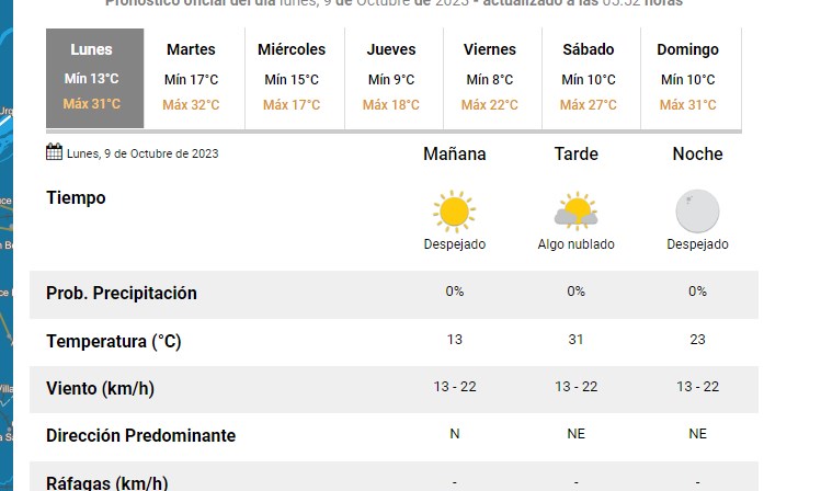 El SMN pronostica para la ciudad de Santa Fe hoy lunes 9 de octubre 2023