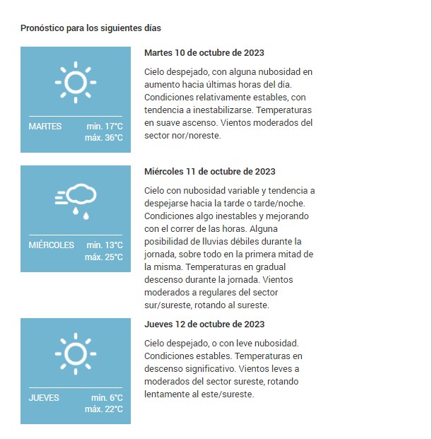 Cielo despejado, o con leve nubosidad. Condiciones estables, con tendencia lenta y gradual a inestabilizarse. Temperaturas en suave ascenso. Vientos leves a moderados del sector del este/noreste, rotando al nor/noreste.