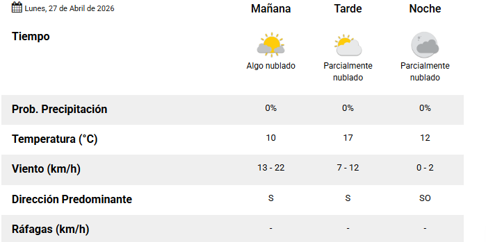 El SMN pronostica para hoy lunes 27 de abril 2026 en la ciudad de Santa Fe de la Vera Cruz capital de la República Argentina.