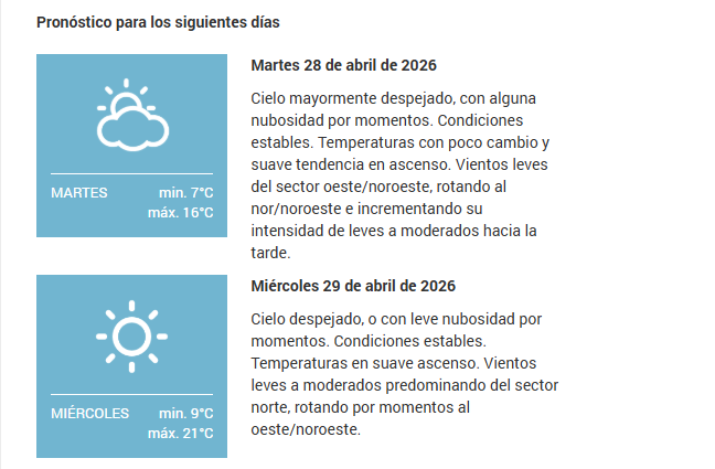 Cielo despejado, o con leve nubosidad por momentos. Condiciones estables. Temperaturas con significativo descenso. Vientos leves a moderados del sector suroeste, rotando al oeste/noroeste hacia la tarde.