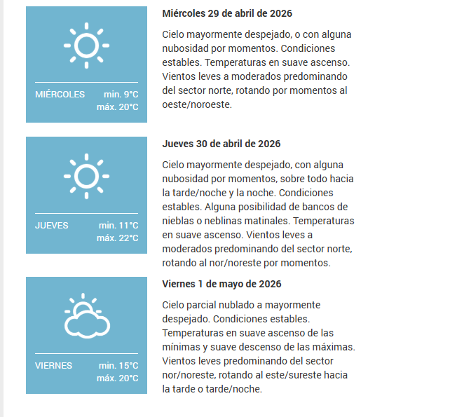 Cielo mayormente despejado, con alguna nubosidad variable por momentos. Condiciones estables. Muy baja posibilidad de algunos chaparrones débiles y aislados. Temperaturas con poco cambio y suave tendencia en ascenso. Vientos leves predominando del sector norte, oscilando entre el noroeste y el noreste e incrementando su intensidad de leves a moderados hacia la tarde.