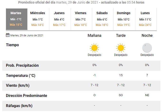 Cielo despejado, o con leve nubosidad. Condiciones estables. Temperaturas en suave descenso. Vientos leves predominando del sector oeste/suroeste, rotando al sur/sureste hacia finales de la jornada.