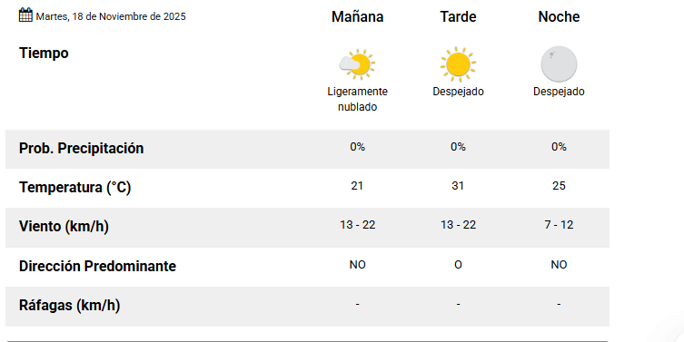 El SMN pronostica para hoy martes 18 de noviembre 2025 en la ciudad de Santa Fe de la Vera Cruz capital de la provincia de Santa Fe República Argentina.