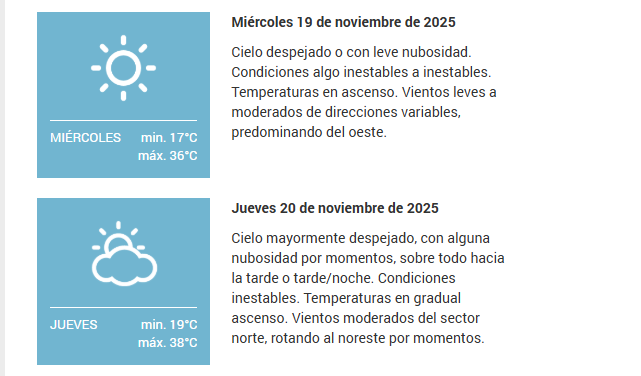 Cielo despejado o con leve nubosidad. Condiciones relativamente estables a algo inestables. Temperaturas en suave ascenso de las mínimas y ascenso significativo de las máximas. Vientos moderados del sector norte, rotando por momentos al oeste/noroeste.