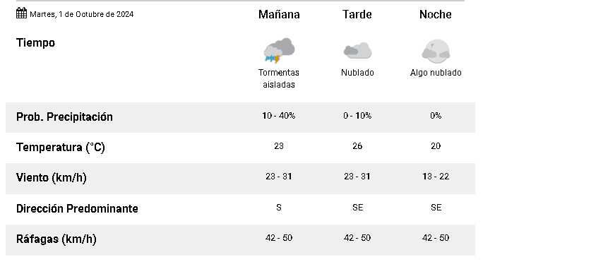 En tanto que el Centro de Informaciones Meteorológicas de la FICH pronostica para hoy martes 1 de octubre 2024 para la ciudad de Santa Fe, capital de la provincia de Santa Fe República Argentina.