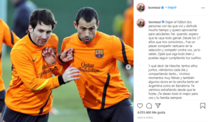 Lionel Messi envió hoy un cálido saludo a través de Instagram a sus excompañeros del seleccionado argentino Fernando Gago y Javier Mascherano, quienes anunciaron sus retiros del fútbol profesional.