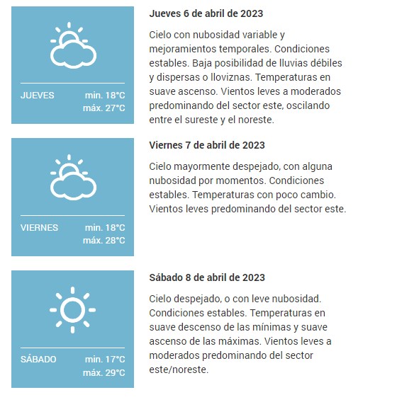 Las condiciones son estables. En el día de la fecha, si bien se observa en la región el predominio de aire superficial desde el este/sureste, el cual transporta humedad desde el océano, en altura se mantienen las corrientes cálidas en los distintos niveles de la atmósfera. Esta situación permite que las jornadas se mantengan con alternancia entre despejadas y con nubosidad variable, esperándose una baja probabilidades de lluvias débiles y dispersas o lloviznas durante la jornadas de mañana jueves. Respecto a las temperaturas, deberían oscilar entre los 17° y los 19°C y los 25° a 29°C. Por lo que se espera para lo que resta de la jornada en el área de influencia: