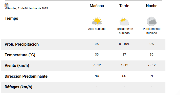 El SMN pronostica para hoy miércoles 31 de diciembre 2025 en la ciudad de Santa Fe de la Vera Cruz capital de la provincia de Santa Fe República Argentina.