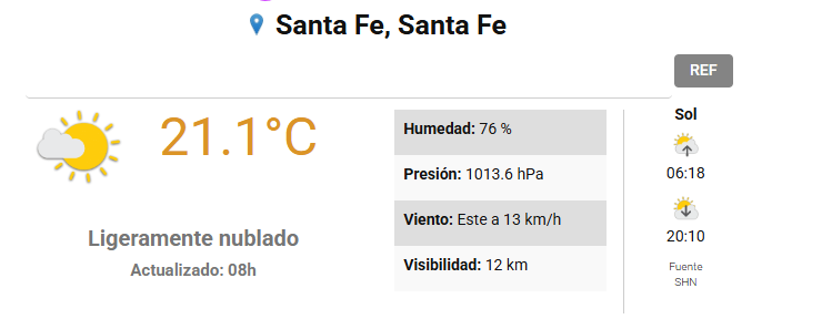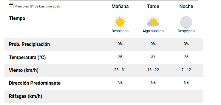 En tanto que el Centro de Informaciones Meteorológicas de la FICH-UNL pronostica para hoy miércoles 21 de enero 2026 en la ciudad de Santa Fe de la Vera Cruz capital de la provincia de Santa Fe República Argentina.
