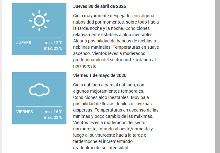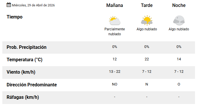 Cielo mayormente despejado, o con alguna nubosidad por momentos. Condiciones relativamente estables. Temperaturas en suave ascenso. Vientos leves a moderados predominando del sector norte, oscilando entre el noroeste y el noreste.